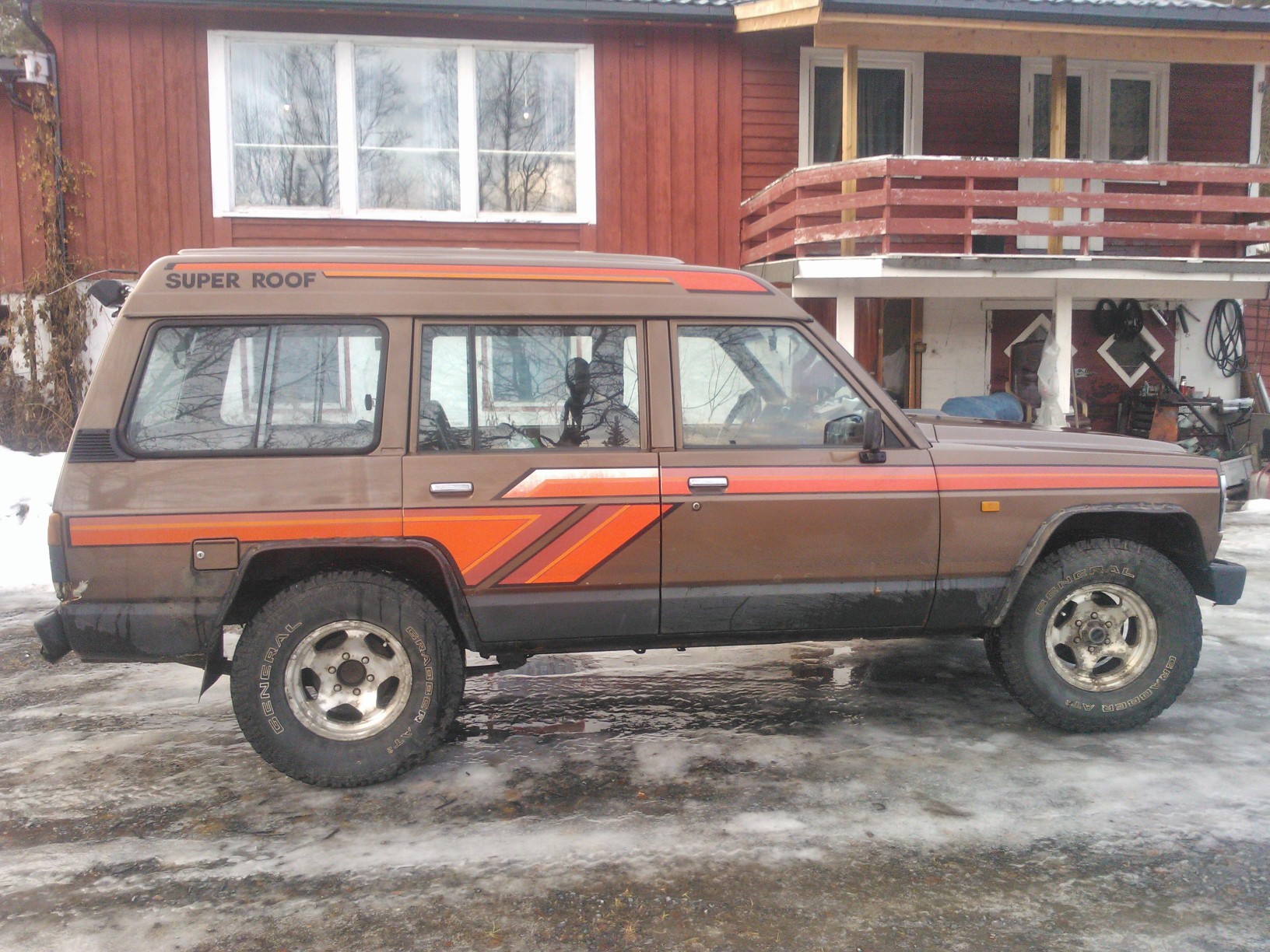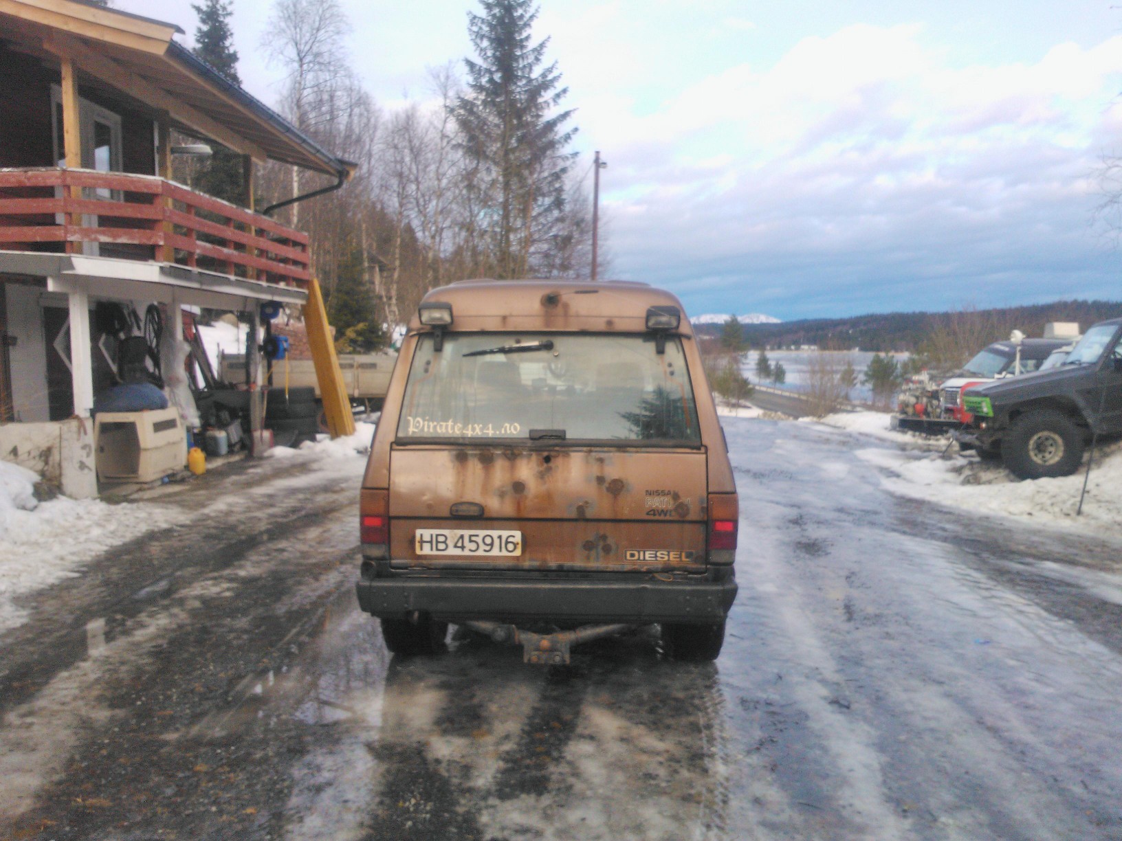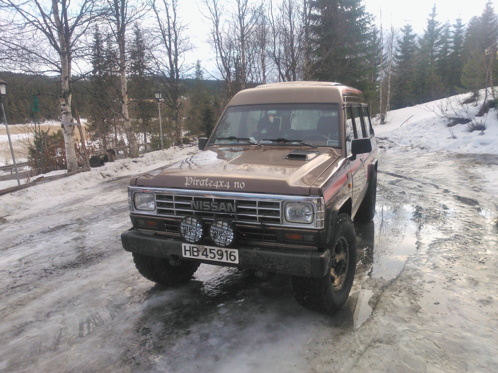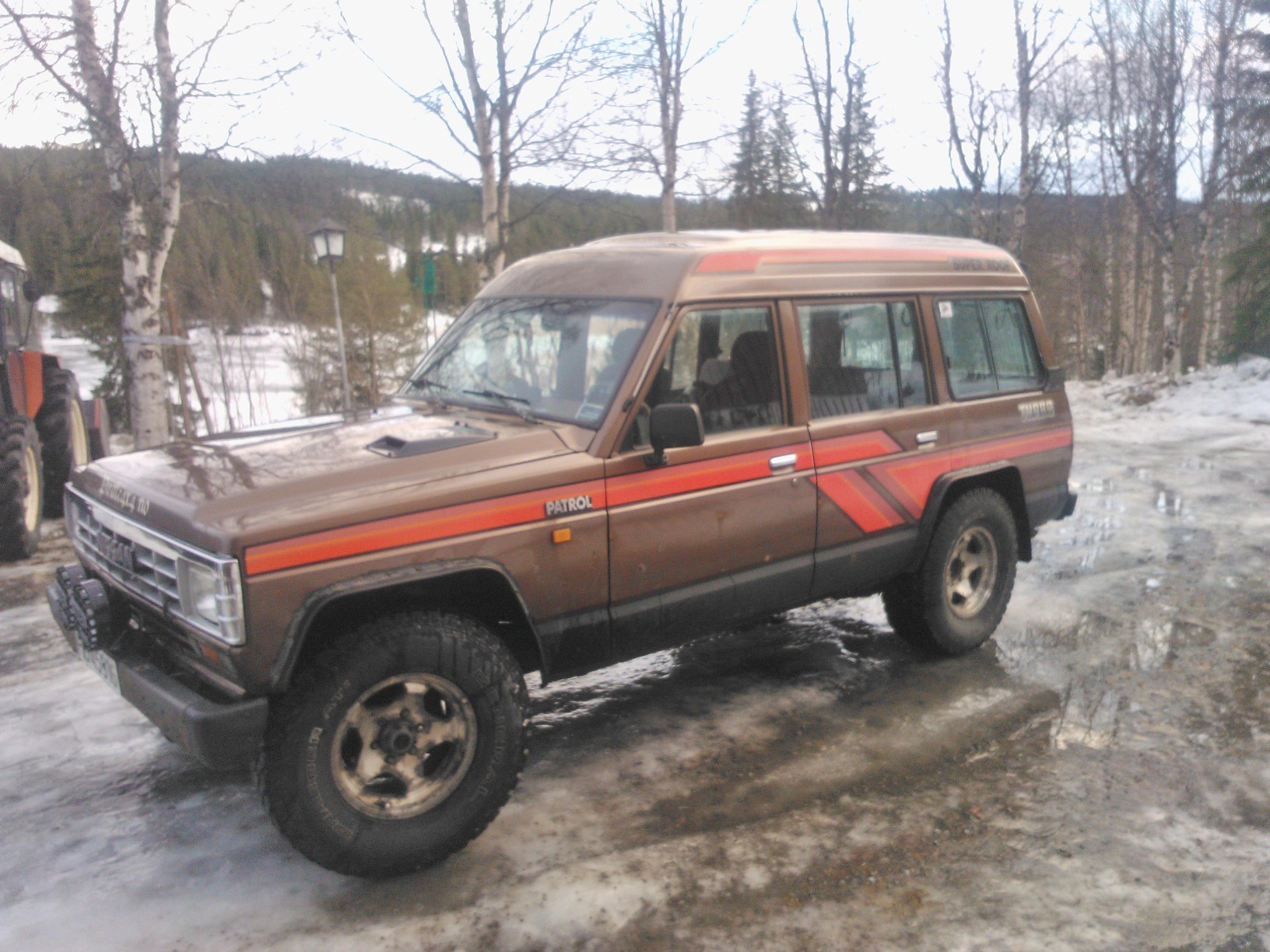 Den er gått snart 418000. Rust finnes. Bilen står på 285/75/16 på 8x16 felger og er ikke hevet. Bilen befinner seg på Berkåk i Sørtrøndelag. Originalhjul følger med. Pris med bare originalhjul er 11000,- Eu-Ok til juni 2013. Har en annen bakluke som kan følge med. Kan byttes i bra 37-38 på felg for Nissan Patrol.