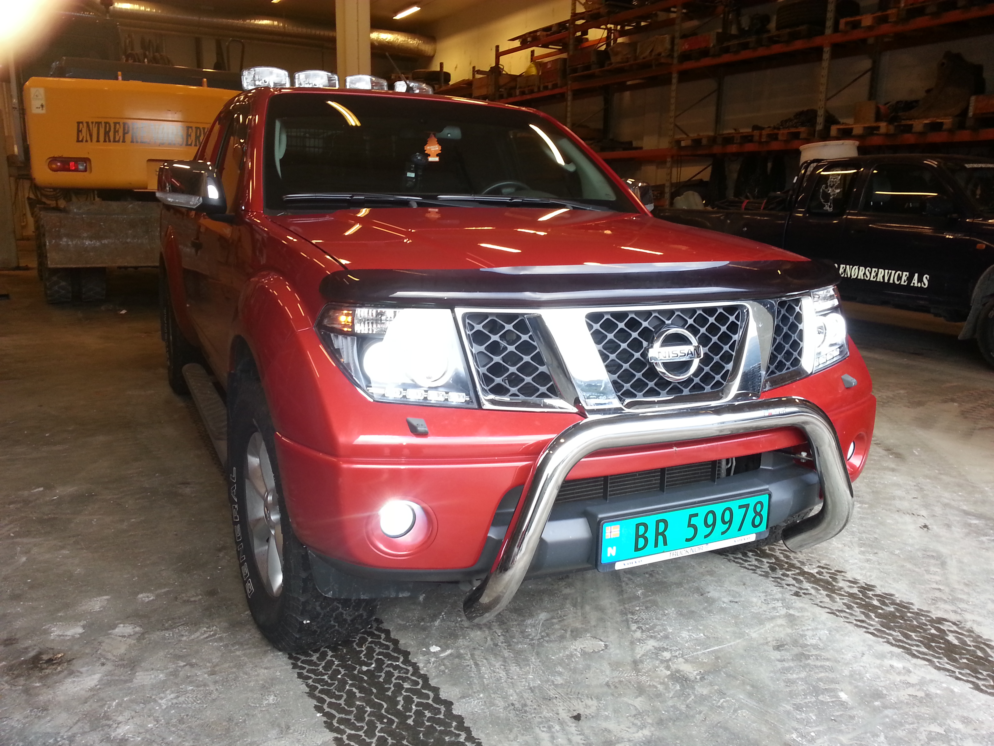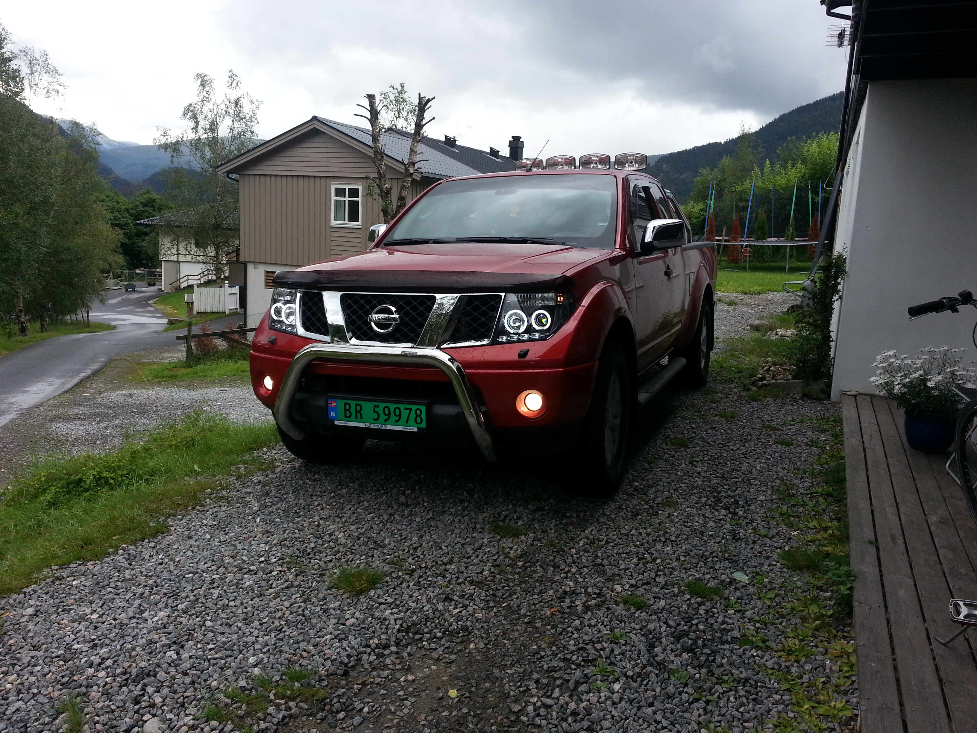 Etterkvert fant eg ut at eg ville bytte kupe, hanskerom, golv og midtkonsoll lysa til led pærer! Er mykje finare etter mi meining. Bytta også lysa i speila til led! ( ende opp med to knust spegel i forbannelse! ) En dag kom eg over eit bilde av ein Navara med andre type lykter. Lette og lette var hos forhandlar og diverse men virka som det ikkje er noko og velje i i Norge! Så begynte og surfe på nettet og fant lykter på Ebay. Dei passa ikkje heilt med det første men etter mykje herkjing satt dei! xenon blei montert dagane i etterkant i både nær og fjern samt led i tåkelys. Hadde også sett meg mektig lei av det dårlige ryggelyset til Navara! så fant ei sterk led pære og bytta den. Det vart ei grei forandring så monterte to led arbeidslamper inn under bilen som vende bakover som eg kopla inn på ryggelyset med brytar. Samtidig monterte eg to arbeidslys på planet. På fritida driver eg mykje med motorsport og eg kjører ein del hengar (BE) Kom da inn på tanken av ryggekamera men sleit med å finne plassering! fikk da høre om ryggekamera som var montert i skilt plate og det fungerer som bare det!! Da kom vi til det med større hjul. Har tenkt på det sida eg kjøpte bilen. Kom over forumet her og las at med heving ville ein få plass til 33'' Kjøpte da hevesett og fekk heva bilen 2,5'' framme og 1,5'' bak. Men har ikkje komt lenger med dekk sidan det vart vinter! Så da vart det montert Defa Warmup II pakke og Motorvarmer element.