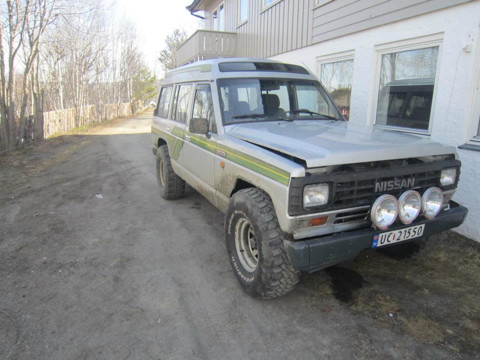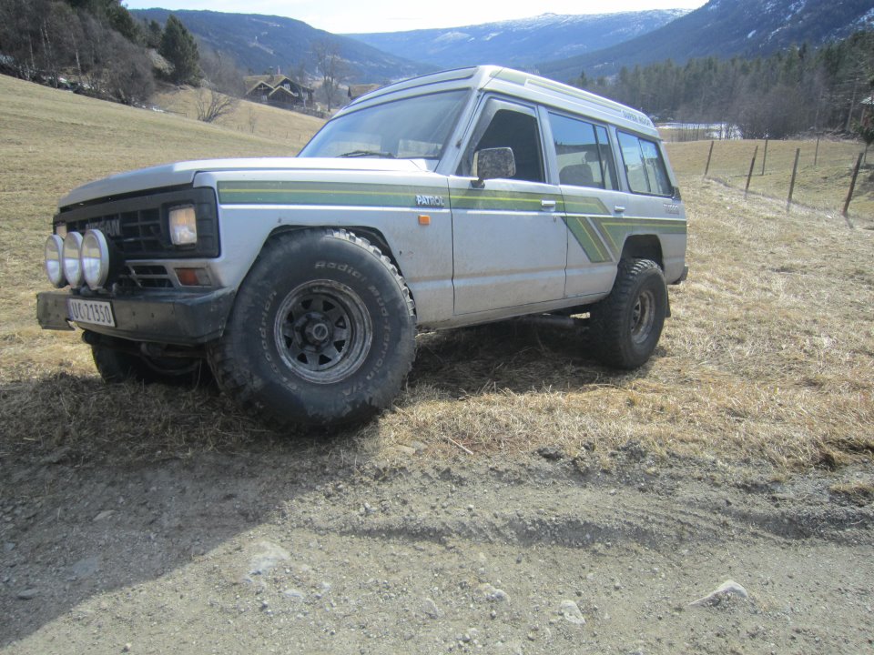 Har ein 90mod Nissan patrol y60 2,8td, 10x15 felger med 33 12,5 15" dekk, har diverse planer som kufanger/bøyle med 3-4 tusenmetrer og stigtrinn og litt diverse:) har hatt bilen 1 uke så får ta litt etterhvert..